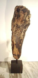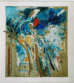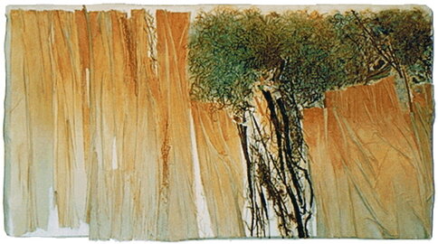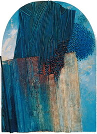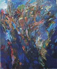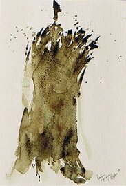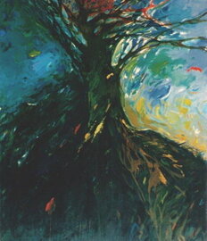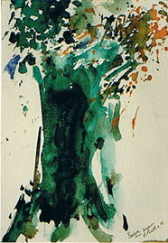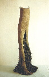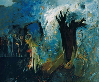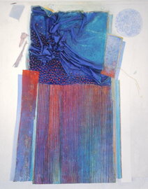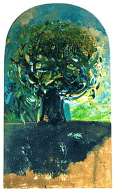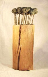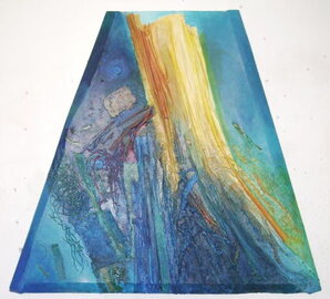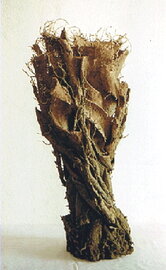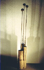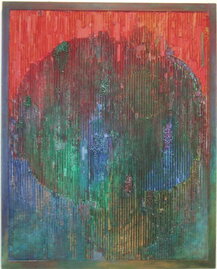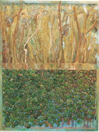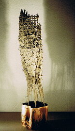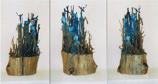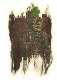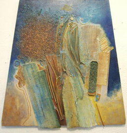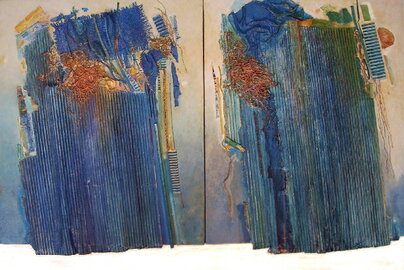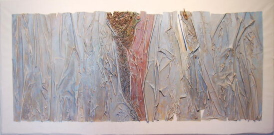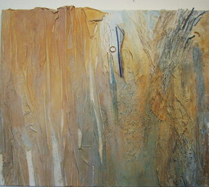 Materialien für die Bilder: Collagen und Mischtechniken auf Leinwand und auf Holzplatten, in Öl und Acryl, bei manchen feinster Sand, Naturwurzeln.